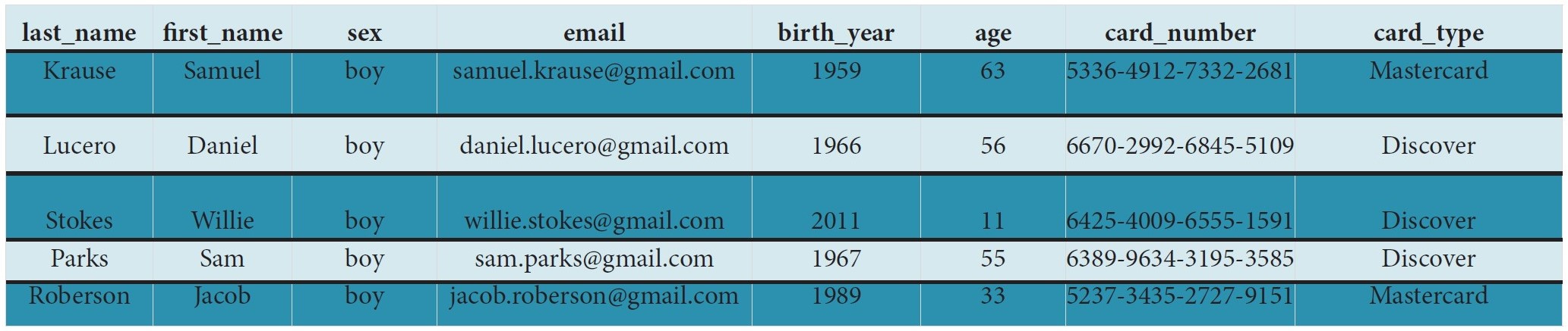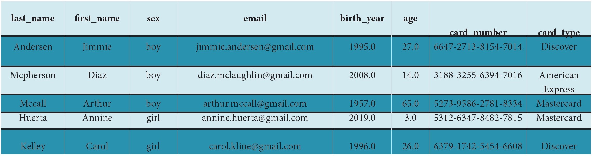 5. Coloana card_number a fost generată prin definirea unui șir de 19 caractere, conținând 4 grupuri, fiecare cu 4 cifre, separate prin "-". Prima cifră din primul grup este un număr din setul {3,4,5,6}. De exemplu: 6789-0123-4567-8910.