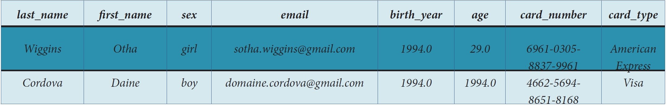 Pentru a aprofunda investigarea relației dintre datele din modelul prezentat și datele sintetice, am verificat, de asemenea, corespondențele exacte ale coloanelor. Putem vedea că modelul nu numai că a mixat unele dintre numele și prenumele pentru a crea noi e-mailuri, ci a generat și nume noi. De asemenea, autenticitatea este de 100% pentru numerele de card generate.