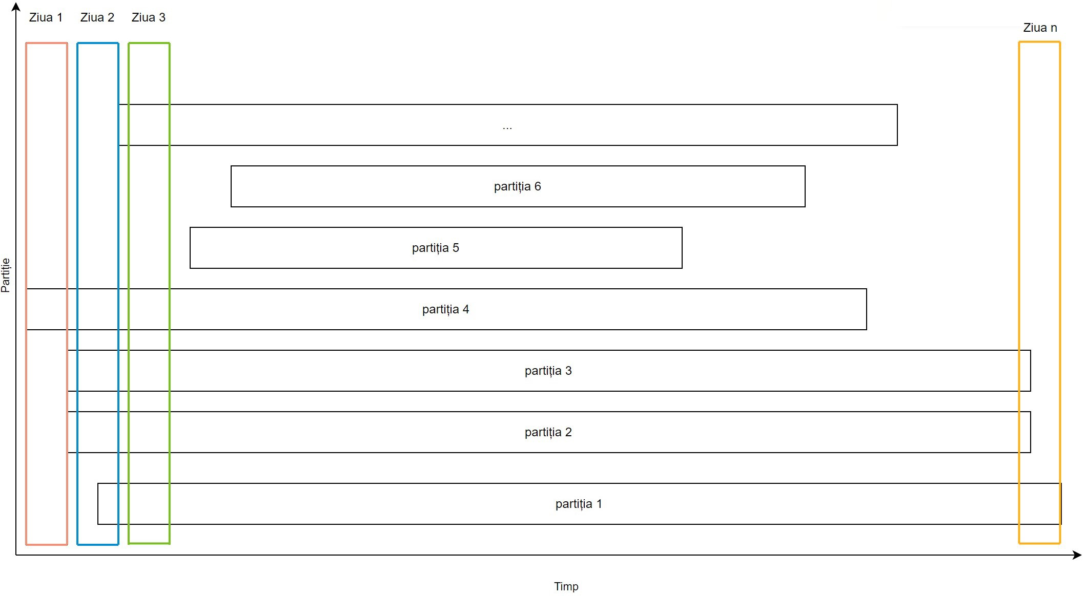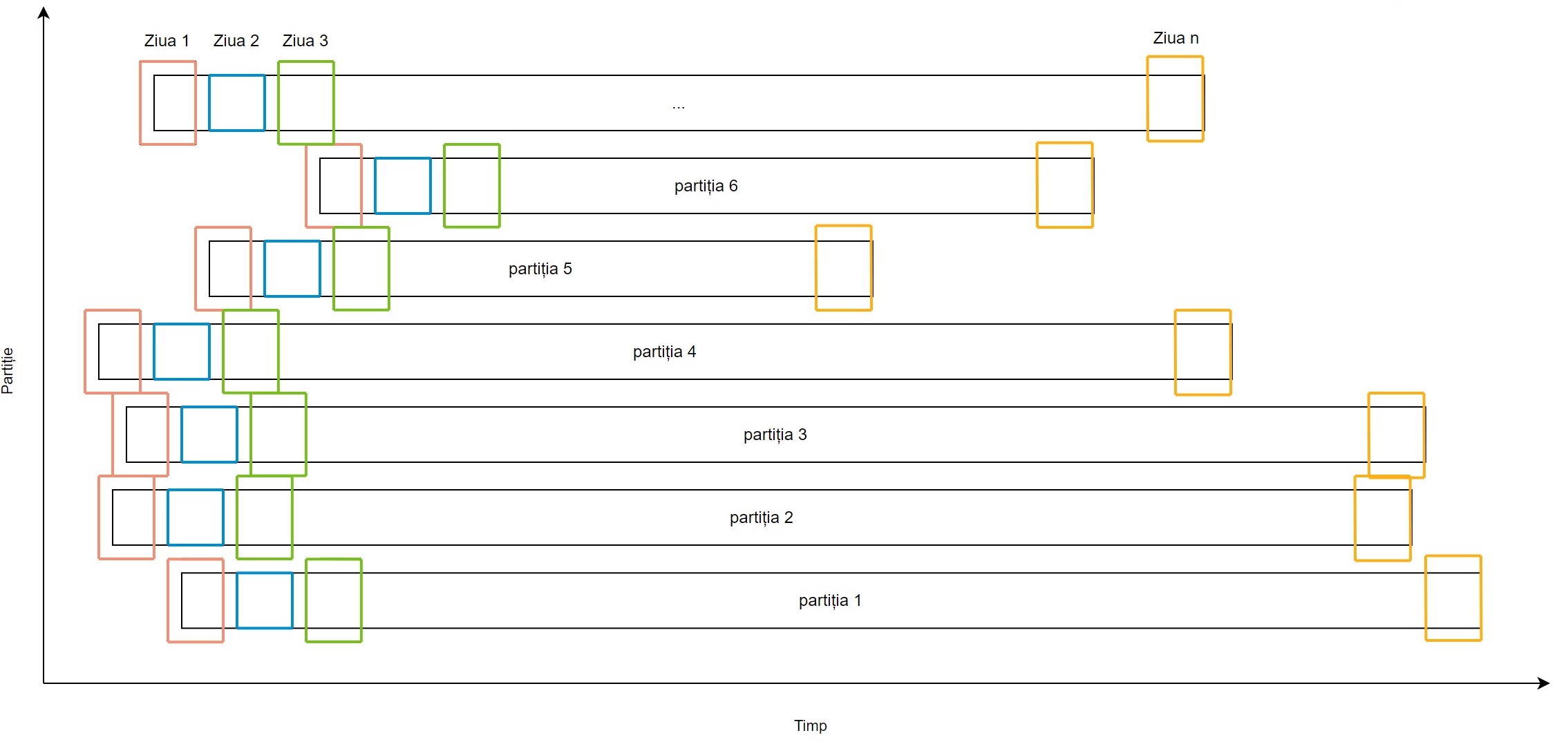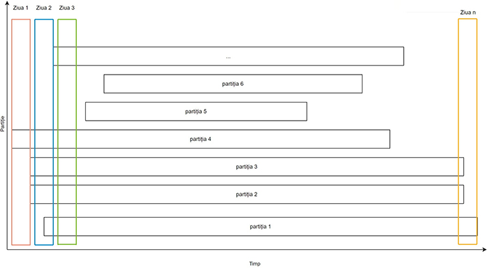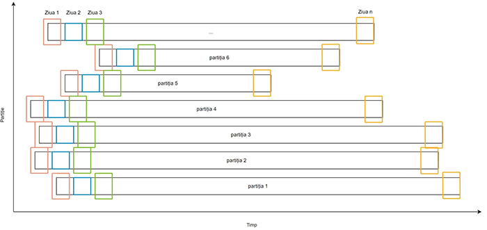 În Figura 1 se poate observa distribuția partițiilor referitoare la timp și ceea ce am dorit să obținem: toate pătratele marcate cu Ziua 1 din fiecare partiție trebuie să fie procesate concomitent, înaintea oricărei alte zile din fiecare partiție. Toate pătratele din Ziua 2 trebuie să le urmeze imediat și așa mai departe.