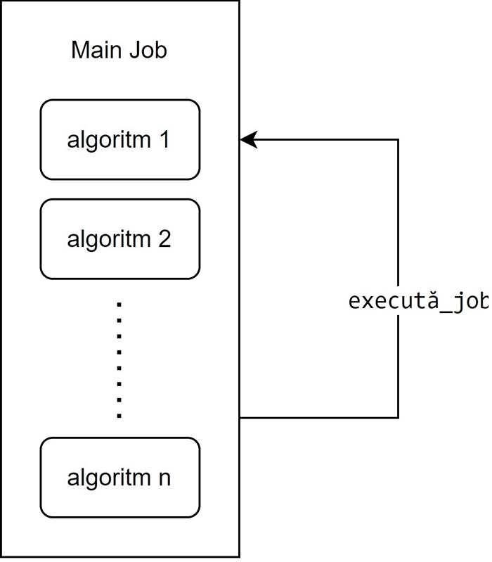 Cea de-a doua implementare este foarte asemănătoare la nivel conceptual, diferența fiind că la finalul unui job se va lansa o altă execuție a aceluiași job, însă cu parametrii diferiți, primul încheindu-și execuția.