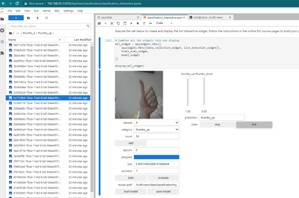Odată pornit containerul putem să ne conectăm la notebook accesând: http://192.168.55.1:8888/ și folosind parola dlinano și să verificăm conexiunea cu camera video /hello_camera/usb_camera.jpynb.