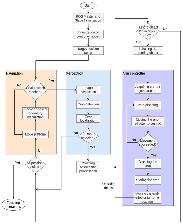 Sistemul de comandă pentru operațiunea de recoltare autonomă este prezentat în fig. [fig: flowchart]. Acesta este compus din trei module principale care verifică periodic îndeplinirea anumitor condiții. Operațiunile încep cu inițializarea nodului de tip master și conectarea la nodul de tip sclav. Este adus apoi robotul și se pornește modulul de navigare. Un operator uman stabilește punctele de destinație unde pot fi găsite produsele agricole țintă, iar robotul începe să le viziteze. Atunci când ajunge la obiectivul dorit, se activează nodul de percepție, nodul de navigare fiind temporar oprit. Procesorul integrat începe să prelucreze imaginile captate de camera de adâncime, obiectele identificate fiind astfel localizate. Pentru toate produsele agricole detectate se verifică dacă acestea se află în raza de acțiune a robotului, iar acelea care îndeplinesc condiția, sunt numărate și salvate într-o listă, împreună cu coordonatele aferente privind adâncimea. Următorul pas este ierarhizarea obiectelor în funcție de distanța măsurată față de senzorul de imagine, prioritare fiind cele din imediata apropiere. Odată ierarhizate obiectele, se pornește nodul de comandă a manipulatorului, translatându-se coordonatele obiectelor în sistemul de coordonate al efectorului terminal. Astfel, unghiurile articulațiilor manipulatorului se calculează folosind metoda de calcul cinematic invers, în timp ce traiectoria de mișcare a obiectelor este programată cu ajutorul nodului de tip stăpân. În continuare, traiectoria planificată este transmisă spre nodul server al manipulatorului și executată de către manipulator. Întrucât, de multe ori, manipulatorul nu urmează traiectoria stabilită, se verifică acest fapt, iar după aceea dispozitivul de prindere preia produsul agricol țintă. Pentru ca recolta să fie culeasă cu mai multă atenție, pe baza datelor privind adâncimea culturii țintă, se calculează lățimea aproximativă a rândului de plante, dispozitivul de prindere închizându-se la depășirea limitei impuse. Robotul plasează recolta într-o loc prestabilit și actualizează lista produselor agricole țintă. Operațiunea descrisă anterior este repetată de către nodul de comandă a manipulatorului până când lista este epuizată. În continuare, robotul se deplasează spre următoarea destinație, până când vizitează fiecare loc inclus în traseu. La sfârșitul operațiunii, robotul îl informează pe operatorul uman că recoltarea a fost încheiată și se întoarce la punctul de plecare.