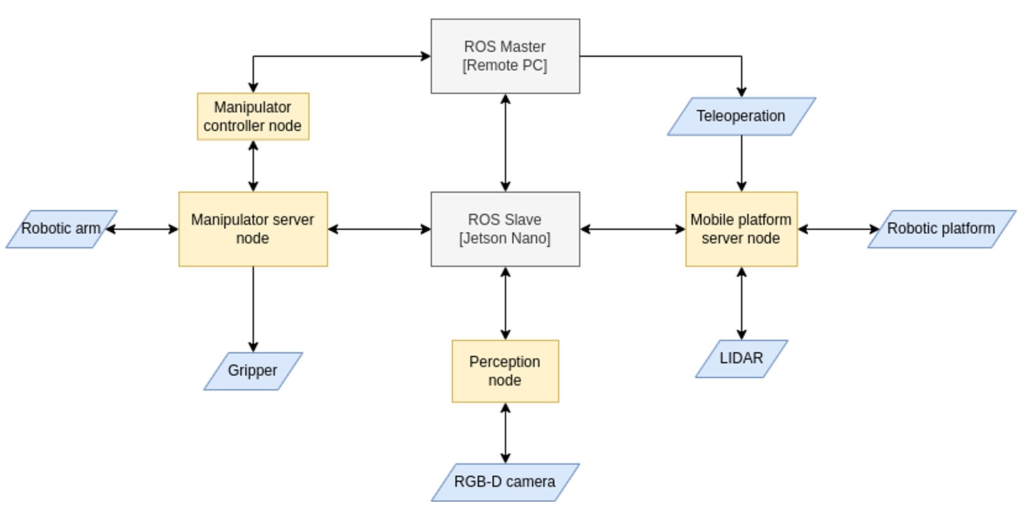 Faptul că sistemul este unul integrat permite robotului să se deplaseze spre punctele stabilite deja de către un operator uman, să se oprească în locurile selectate, să activeze nodul de prelucrare a imaginilor, să localizeze și să prindă obiectele detectate, ca apoi să se îndrepte spre următorul punct. Robotul nu este pe deplin autonom, deoarece punctele în care se oprește trebuie stabilite în prealabil; în schimb, se deplasează și prinde obiectele în mod autonom. Arhitectura robotului este prezentată în fig. [fig: robot_architecture], incluzând atât modulele hardware, cât și cele software. Paralelogramele albastre reprezintă modulele hardware, dreptunghiurile galbene sunt modulele software, iar dreptunghiurile gri reprezintă principalele elemente de coordonare. Configurația ROS de tip stăpân-scalv este utilizată între un PC aflat la distanță și o placă de bază Jetson Nano. Deoarece procesorul integrat are o capacitate limitată de prelucrare, unele procese sunt partajate și executate pe PC-ul de la distanță, comunicarea între calculatoare realizându-se prin internetul fără fir. Nodul coordonator local sincronizează toate informațiile provenite de la module, ia decizii la acest nivel și transmite comenzi nodurilor software. Nodul de tip master oferă o interfață pentru comanda manuală a robotului, inclusiv un modul de intervenție de la distanță utilizat în cartografiere și în cazurile de urgență. În timpul recoltării, nodul de tip master este implicat în programarea mișcării manipulatorului. Nodul platformei mobile comandă roțile și răspunde de planificarea traiectoriei pe baza datelor colectate de la senzorul LIDAR și de la codificatoare, fiind, de asemenea, conectat la modulul de intervenție de la distanță. Nodul de percepție prelucrează imaginile provenite de la camera RGB-D, detectează obiectele și, pe baza informațiilor privind adâncimea, localizează culturile. În continuare, folosind datele provenite de la nodul de percepție, nodul de manipulare comandă brațul robotic și dispozitivul de prindere, parcurgând traseul indicat de nodul de tip stăpân.