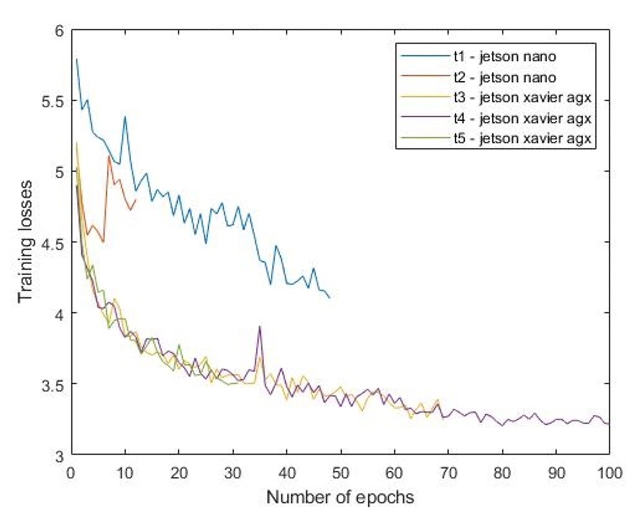 În primul rând, a fost testată rețeaua SSD-MobileNet v2. Utilizând TensorRT, se pot obține rezultate excelente de prelucrare în timp real: 16 cadre pe secundă (FPS). Cu toate acestea, performanțele în materie de detecție nu au fost satisfăcătoare; de aceea, am încercat să le îmbunătățim printr-un reglaj fin în cazul detectării fructelor. Astfel, pentru șapte tipuri dintre acestea (căpșune, portocale, mere, struguri, portocale, banane și pere), am făcut peste 5500 de fotografii, iar apoi am antrenat o nouă versiune a rețelei SSD-MobileNetv2, utilizând conceptul de transfer de cunoștințe și mediul de instruire furnizat de Nvidia. În total, au fost efectuate cinci antrenamente folosind două dispozitive diferite: Jetson Nano (două antrenamente), respectiv Jetson AGX Xavier (trei antrenamente), tabelul comparativ fiind prezentat în fig. [fig: ssd_results]. După cum reiese din grafic, pierderile medii ale rețelelor antrenate folosind Jetson Nano sunt mai mari încă de la început, în comparație cu cele ale rețelelor antrenate utilizând AGX Xavier. Nano nu este adecvat pentru antrenarea rețelelor neuronale profunde, deoarece unitatea de prelucrare grafică (GPU) nu are suficientă memorie și putere. Ca urmare, la un moment dat, se supraîncălzește și trebuie să se oprească. În schimb, Jetson AGX Xavier a avut un randament bun pe parcursul formării, însă s-a putut observa că, după atingerea unui anumit punct, rezultatele se plafonează, neputând fi îmbunătățite cu adevărat nici măcar după 30 de cicluri complete. Pentru antrenamente au fost utilizate următoarele configurații:
