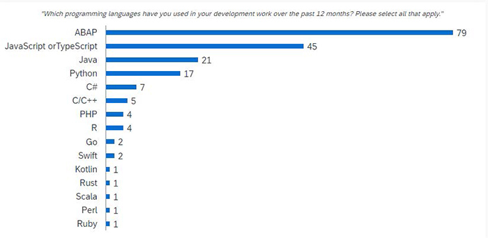Recent, SAP a publicat sondajul 2023 SAP Developer Insights Survey. Din acest sondaj care a avut la bază 2467 de răspunsuri de la programatori din 79 de țări, a reieșit faptul că limbajul de programare ABAP încă domină lumea SAP și că este cel mai popular limbaj de programare. Nimic surprinzător!