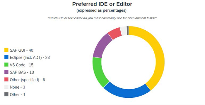 Câți dintre acești programatori folosesc ABAP Cloud ca parte a SAP Business Technology Platform (SAP BTP)? Câți dintre ei folosesc încă ABAP clasic? Din nefericire, din același sondaj reiese că SAP GUI este unul din cele mai folosite IDE-uri/editoare de cod sursă pentru dezvoltarea propriu-zisă de aplicații software.