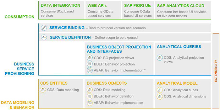 Prin comparație cu lumea clasică ABAP, în cadrul ABAP Cloud, există un model specializat de programare ce trebuie luat în calcul în cadrul procesului de dezvoltare al aplicațiilor, element cheie pentru ABAP Cloud așa cum l-am prezentat în anterior - ABAP RESTful Application Programming Model (RAP) - ce constă dintr-un set de concepte, tooluri, limbaje și paradigme ce permit un flux standardizat de dezvoltare în Eclipse IDE with ABAP Development Tools (ADT) a diferite tipuri de servicii și API-uri, precum servicii fundamentate pe Odata pentru dezvoltare UI consumate de aplicații SAP Fiori bazate pe SAP Fiori Elements sau chiar aplicații SAP Fiori-freestyle (read-only sau transactional draft/non-draft enabled). Mai includem și serviciile bazate pe Odata pentru expunere sub formă de Web APIs, dar și serviciile analitice configurate pe InA (SAP Information Access Protocol) consumate de diferite tooluri analitice (i.e. SAP Analytics Cloud, SAP WebDynpro Data Grid).