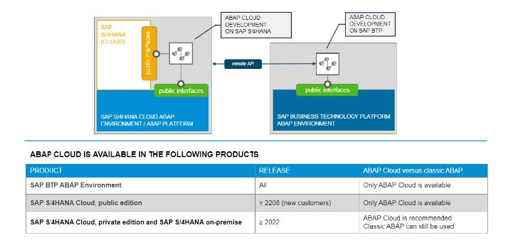 ABAP Cloud este disponibil în SAP BTP ABAP Environment, SAP S/4HANA Cloud, public edition (>= release 2208), dar și în SAP S/4HANA On Premise sau SAP S/4HANA Cloud, private edition (>= release 2022) așa cum putem observa din imaginea de mai jos.