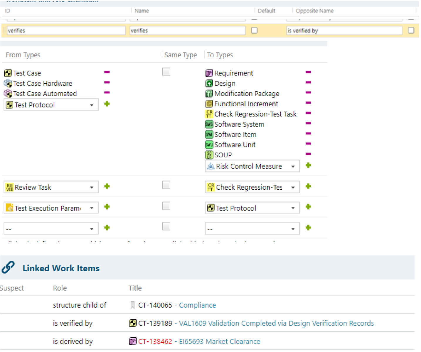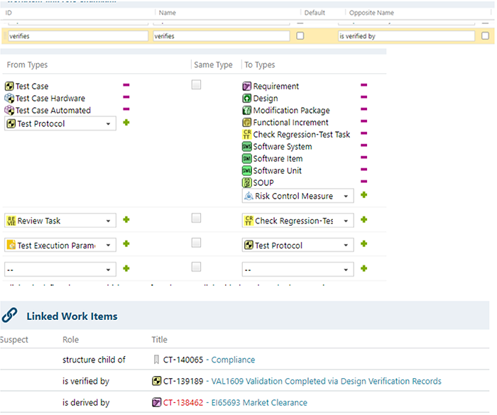 Dependințele sau relațiile ori linked work items sunt un element foarte important în ansamblul unei aplicații de tip ALM, trebuind definite și configurate foarte clar încă de la început pentru a nu genera erori logice majore în sistem. (De exemplu: o cerință nu va verifica un test ci un test verifică o cerință).