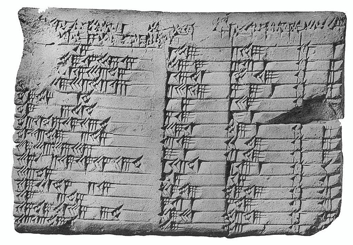 Fig. 1 Tableta babiloniană Plimpton 322 din lut, ~1800 î.Hr., autor necunoscut; Sursă: Plimpton 322 - Wikipedia