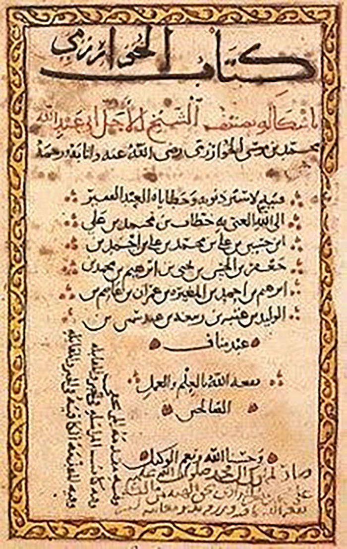Fig. 3 Pagina de titlu a cărții Cartea Compendiu despre calculul prin completare și echilibrare; Sursă: The Compendious Book on Calculation by Completion and Balancing - Wikipedia