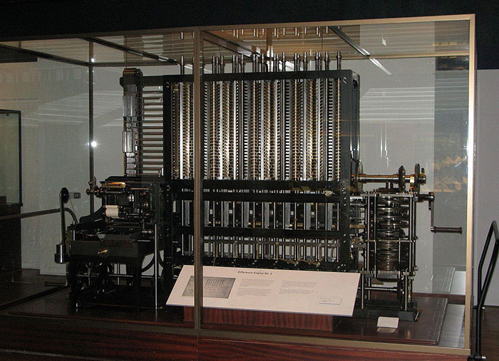 Fig. 5 Motorul de diferențe al Muzeului de Știință din Londra, primul construit după proiectul lui Babbage. Proiectul are aceeași precizie pe toate coloanele, dar în calculul polinoamelor, precizia pe coloanele de ordin superior putea fi mai mică. Sursă: Wikimedia commons