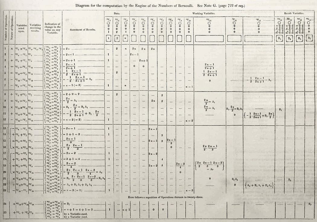 Fig. 4 Diagrama unui algoritm pentru Motorul Analitic pentru calculul numerelor Bernoulli, din Sketch of The Analytical Engine Invented by Charles Babbage de Luigi Menabrea, cu note de Ada Lovelace. Pașii descriu modul în care motorul analitic ar calcula B8, pe care ea l-a numit B7 în notația sa. Sursa: Wikimedia Commons