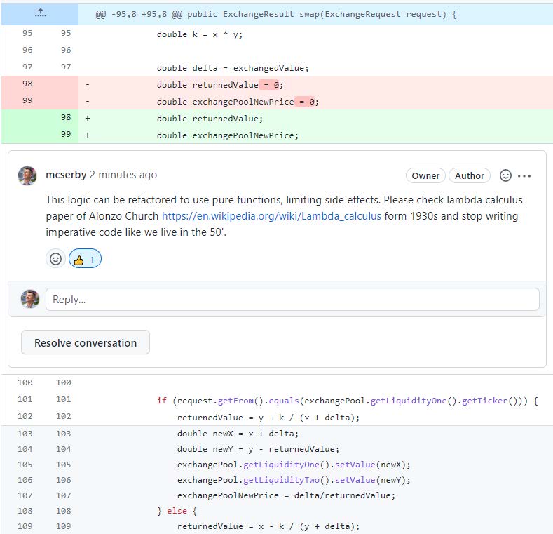 Orice funcție recursivă poate fi exprimată iterativ și viceversa, lucru demonstrat în anii '30. Atunci au fost propuse trei modele computaționale diferite: funcțiile general recursive ale lui Kurt Godel (da, aceeași persoană care a demonstrat că matematica e incompletă), calculul lambda a lui Alonzo Church și mașina Turing a lui Alan Turing. Ulterior s-a arătat că cele trei modele sunt echivalente. Mai simplu spus: ce poate fi exprimat recursiv (Kurt Godel), poate fi exprimat iterativ (Turing), dar și funcțional (Church). Acest fapt este atât de bine-cunoscut încât există multe companii care interzic codul recursiv. Așa că programatorii trebuie, uneori, să convertească codul recursiv în iterativ. Din nefericire pentru ei, nu pot răspunde că "nu se poate", deoarece chiar și managerii știu că "se poate". Mai mult decât atât, programatorii cu un stil imperativ se trezesc adesea cu comentarii la "pull requesturi", precum cel de mai jos, acum când programarea funcțională este pe val.