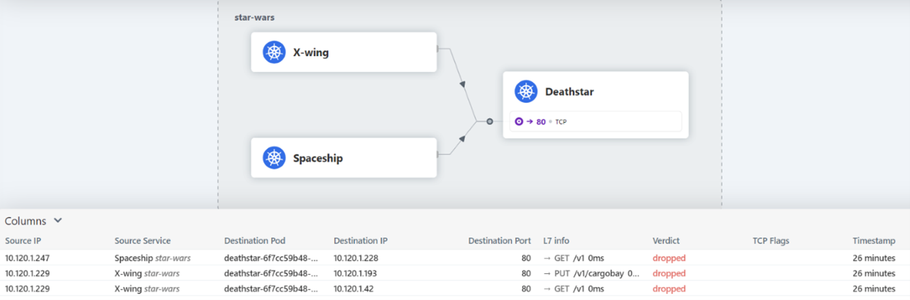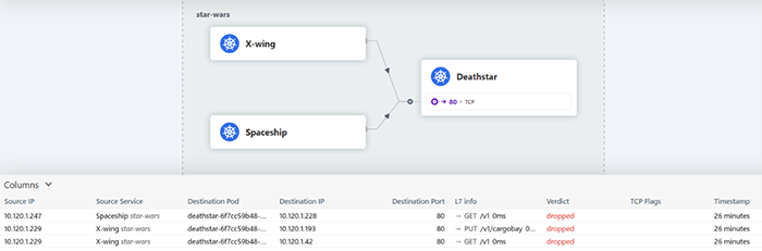 Pentru a pune la încercare Cilium și Hubble, am implementat o aplicație cu tematica "Star Wars" pe Pod-uri Kubernetes denumite după nave spațiale iconice. Implementând un CiliumNetworkPolicy, am reglementat cu atenție accesul la nava spațială Deathstar. Am efectuat apoi teste, pentru a examina eficacitatea acestei politici, iar rezultatele au fost fascinante - unele Pod-uri au avut acces direct la Deathstar, în timp ce altele au fost restricționate.