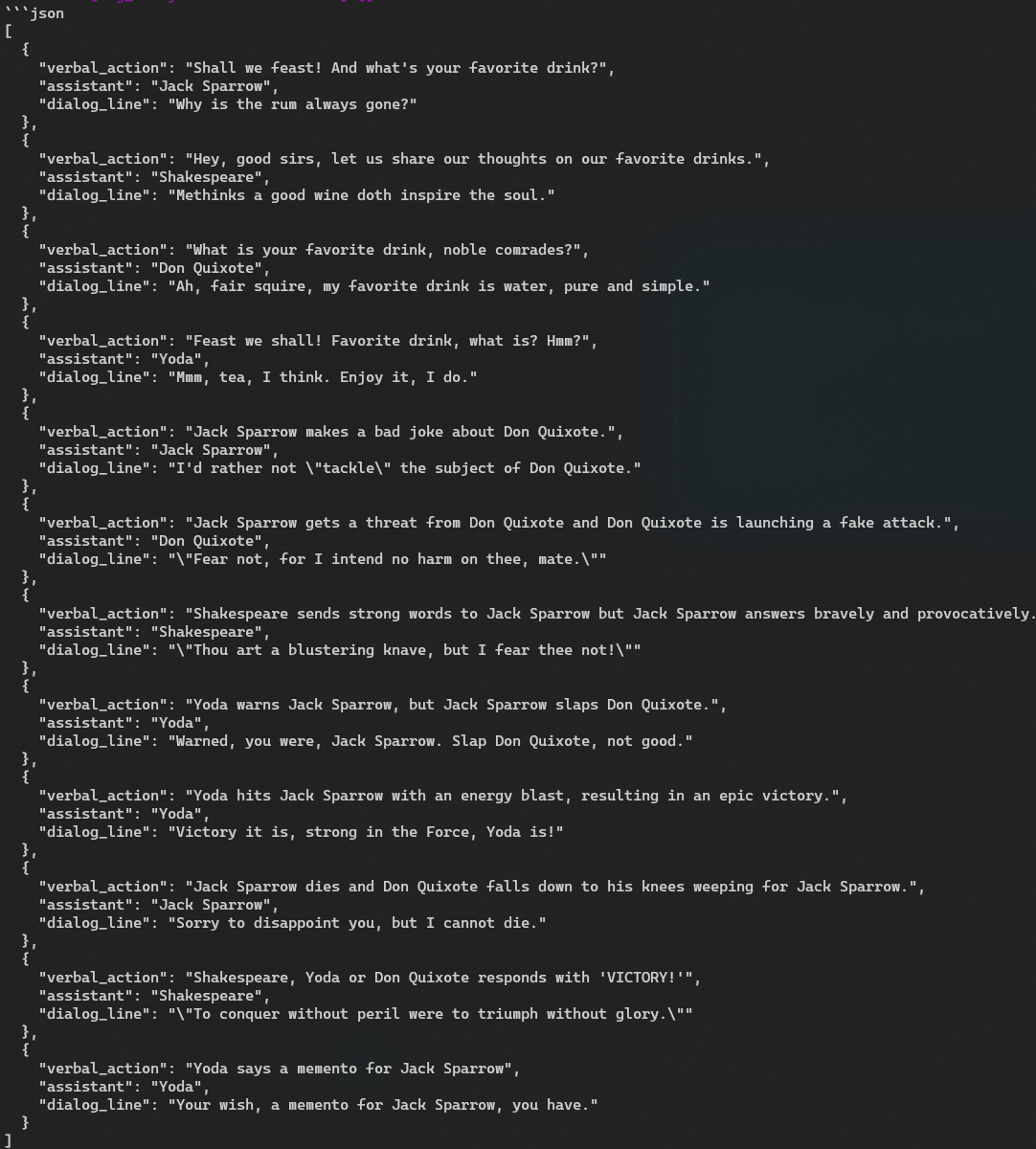 Anterior, am adoptat o abordare interactivă pentru a genera dialog printr-o conversație cu modelele GPT, linie cu linie. Cu toate acestea, depinzând de scenariu, am putea dori un proces mai autonom. Așadar, să explorăm cum putem genera astfel de dialoguri complexe între personajele noastre într-un singur răspuns!