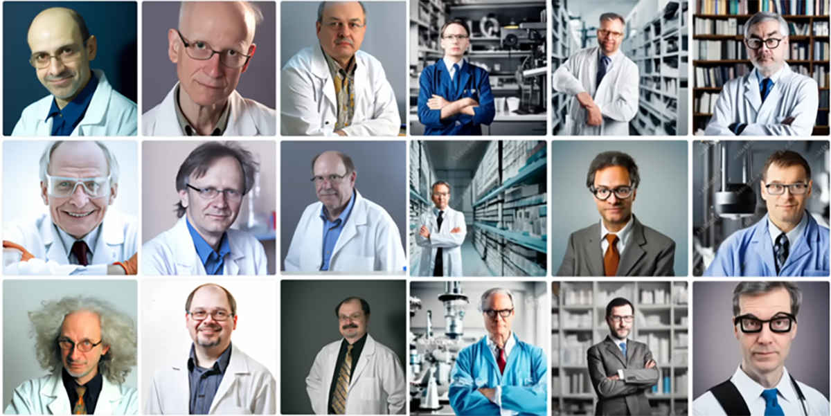 B. Se pare ca IA-ului îi plac stereotipurile, gândind asta, oferă informații false. Din această cauză apar discriminări involuntare și consecințe sociale negative. Când întrebi chat botul să îți arate poze cu oameni de știință. Iată rezultatul: