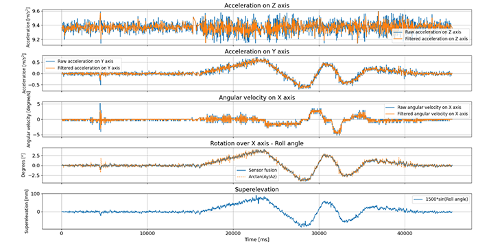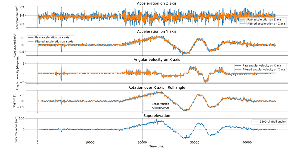 În timpul experimentului, brațul robotic a simulat o supraînălțare, pe ambele fire de șină, efectuând rotații în jurul axei X a MRD-ului. Acest experiment compară două abordări de calcul: 1) calcularea unghiului (roll angle) pe baza accelerației măsurate pe axa Y și Z; și 2) fuziunea senzorului care combină accelerația cu viteza unghiulară.