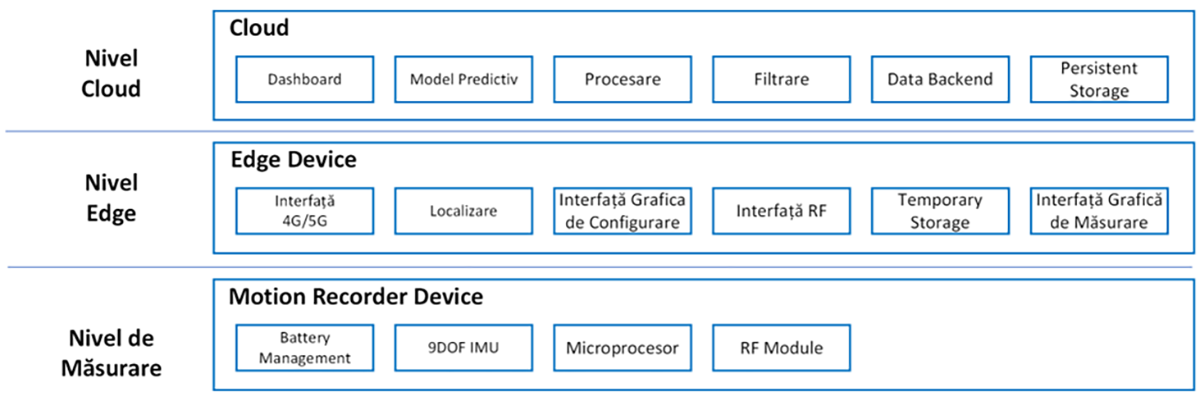 Bazându-ne pe tehnologiile moderne oferite de IoT, edge- și cloud-computing putem defini sistemul de monitorizare pe trei nivele (Figura 1).