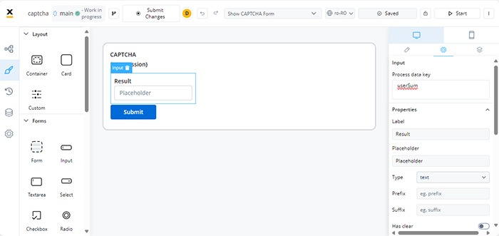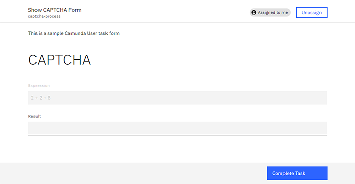 Pentru a evalua perspectivele anterioare în raport cu fiecare platformă, vom trece prin implementarea unui caz de utilizare comun. Cerința este să definim un proces în care utilizatorului i se afișează un CAPTCHA matematic, care trebuie să completeze răspunsul corect pentru un rezultat de succes. De exemplu, următorul este o redare în timp real a formularului în aplicația Tasklist a Camunda:
