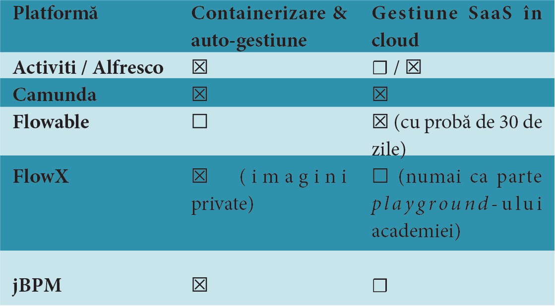 De asemenea, dincolo de experiența dezvoltatorului, proiectele BPM sunt, poate, de cele mai multe ori eforturi de integrare peste logica și serviciile de afaceri existente expuse ca API-uri REST sau chiar SOAP în ecosistemele vechi. Fluxurile de lucru bazate pe evenimente, pe Kafka sau pe alte sisteme de mesagerie sunt foarte comune în zilele noastre. Este important să determinăm în ce moduri acestea pot fi integrate, inclusiv din punctul de vedere al securității. Posibilitatea de a rula platforma on-premise este un plus în evaluarea oricăror eforturi suplimentare necesare pentru o implementare completă. În plus, unele afaceri, cum ar fi cele din sectorul financiar, încă evită să ajungă în cloudul public. Din fericire, majoritatea platformelor BPM sunt deschise pentru a oferi afacerilor o cale auto-gestionată.