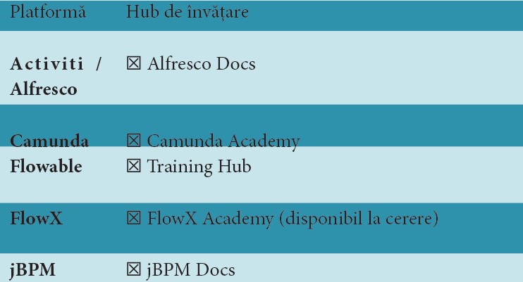În plus, cantitatea și calitatea materialelor de instruire sunt importante, mai ales când vine vorba de a afla specificul definirii anumitor activități și de a executa un proces de afaceri. Majoritatea platformelor oferă un hub de învățare centralizat, de multe ori denumit academie. Ele includ, de asemenea, cursuri introductive în BPMN, așa că este posibil să găsiți hubul de învățare al unei platforme mai bun pentru a dobândi teoria în timp ce implementați BPMN cu alta.