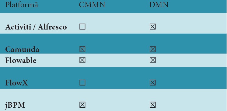 Deși toate platformele implementează BPMN 2.0, ele nu vin cu acoperire completă. De exemplu, documentația Camunda listează tipurile de elemente suportate din toate cele disponibile în specificație. Trebuie să vă asigurați de acoperire înainte de a alege una sau alta platformă, dar este foarte probabil ca diferențele să apară doar la activitățile BPMN utilizate mai puțin frecvent.