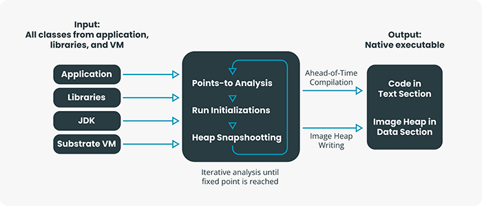 Points-to analysis: este o tehnică de compilare care ajută la identificarea relațiilor dintre pointeri și locațiile în memorie la care acestea indică în timpul execuției programului. GraalVM utilizează această tehnică pentru a determina ce clase, metode și câmpuri pot fi accesate în timpul execuției și le include numai pe acestea în executabil. Analiza are, de regulă, ca punct de pornire metoda main și procesează iterativ tot codul accesibil în mod tranzitoriu până când se ajunge la un punct fix. Această analiză se aplică la codul aplicației, dar și la librăriile externe sau clasele din JDK. Doar codul necesar rulării aplicației este adăugat în executabil.