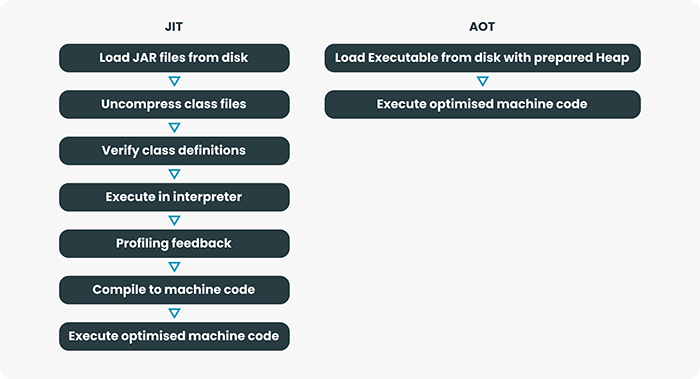 În aplicațiile Java tradiționale, metoda de compilare utilizată este just-in-time (JIT). JVM este responsabil de executarea bytecode-ului Java și de compilarea codului utilizat frecvent în native code pe baza informațiilor rezultate în urma profilingului din timpul execuției. Avantajul acestui tip de compilare este că permite ca JVM-ul să livreze cod optimizat pentru îmbunătățirea performanțelor de vârf și pentru așa-numita aplicație platform-independent. Dar aceste avantaje vin și cu anumite dezavantaje: JIT folosește mult JVM în timpul execuției, ceea ce duce la un timp de pornire mai mare și la introducerea unui warm-up time. În plus, JIT necesită un JVM pentru a executa codul, ceea ce implică o utilizare crescută a resurselor și la o amprentă de memorie mai mare. AOT urmărește să îmbunătățească aceste aspecte.