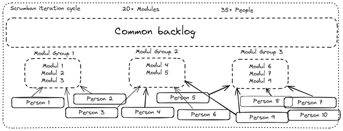 Să luăm proiectul meu ca exemplu de creare a cadrului nostru Agile personalizat: Echipa de proiect este formată din peste 35 de persoane, toate lucrând împreună zilnic ca o singură echipă mare, cu un backlog comun. Proiectul este împărțit în module, care sunt grupate și atribuite unor grupuri de module diferite. Membrii echipei pot lucra la unul sau mai multe module în cadrul aceleiași iterații. Iterațiile urmează principiile Scrumban.