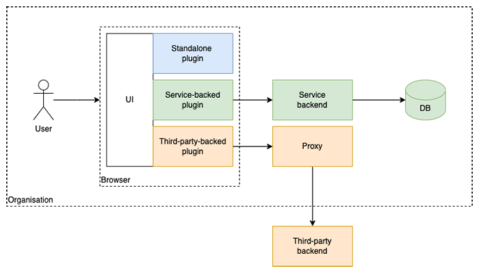În al doilea rând, există pluginuri susținute de servicii backend. Acestea folosesc API-urile unor servicii care sunt găzduite de către organizația care rulează Backstage.