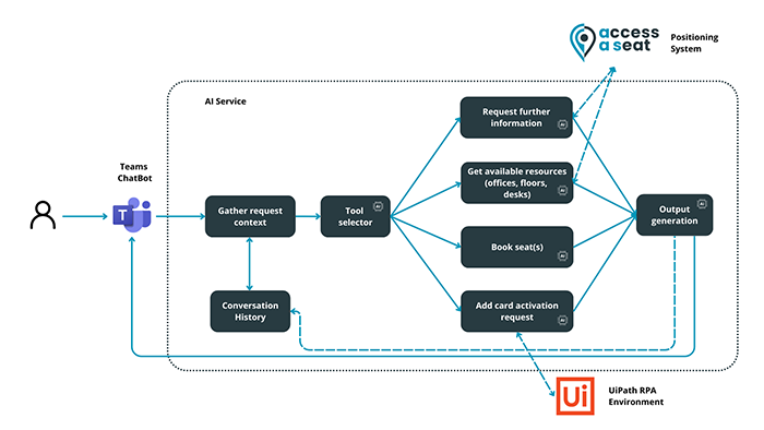Soluția în sine integrează mai multe sisteme—cum ar fi ServiceNow, Access-A-Seat, UiPath și aplicațiile legacy folosite pentru gestionarea accesului fizic în birourile noastre —în Teams, formând un mediu de lucru mai eficient și mai bine organizat, unde echipele pot colabora mai bine, sporind productivitatea și satisfacția la birou.