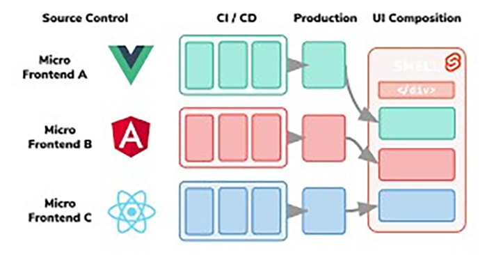 3. Flexibilitate tehnologică. Fiecare microfrontend este autonom, astfel încât poate fi dezvoltat folosind tehnologia care se potrivește cel mai bine nevoilor echipei respective. Astfel, echipele nu sunt constrânse de o singură tehnologie.