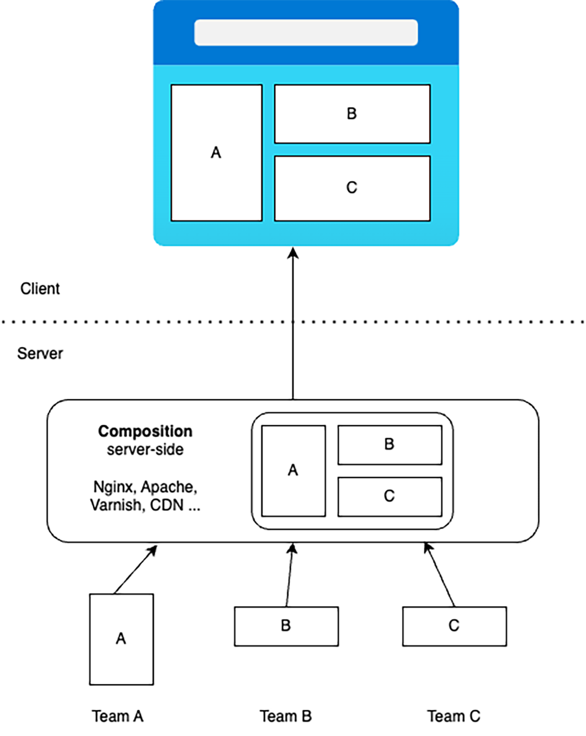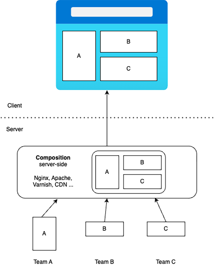 În această abordare, serverul combină mai multe microfrontenduri într-o singură pagină web înainte de a trimite rezultatul către client. Aceasta permite o încărcare rapidă a paginii și oferă o experiență unitară pentru utilizator.