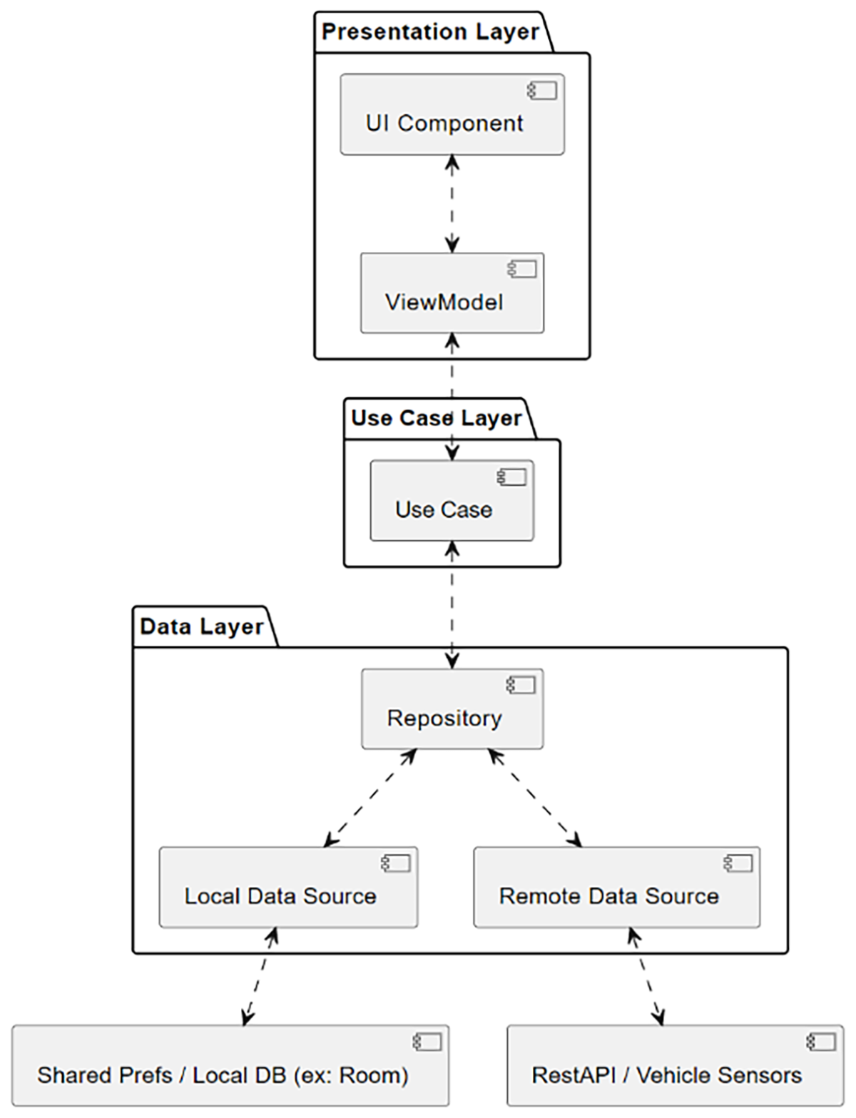 Arhitectura Clean se bazează pe separarea responsabilităților în straturi distincte, fiecare având propriul model de date. Într-o aplicație Android Automotive, arhitectura poate fi organizată în următoarele straturi: