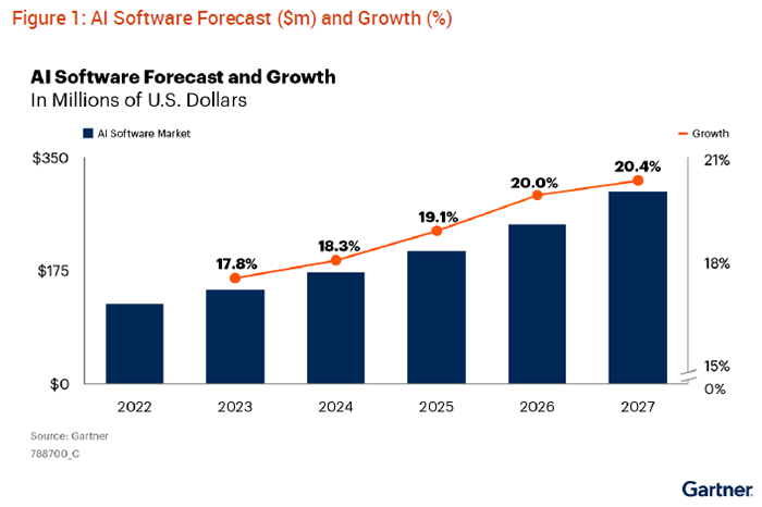 Se așteaptă ca progresele în AI să revoluționeze și mai mult dezvoltarea software-ului. Gartner preconizează (via CDO Magazine) că cheltuielile globale legate de software-ul AI vor crește de la 124 miliarde de dolari în 2022 la 297 miliarde de dolari în 2027, iar cele legate de software-ul GenAI (Generative AI) vor crește vertiginos de la 8% în 2023 la 35% până în 2027. Această creștere va fi determinată de integrarea instrumentelor AI în diverse domenii, cum ar fi marketingul, designul de produse și serviciile pentru clienți.