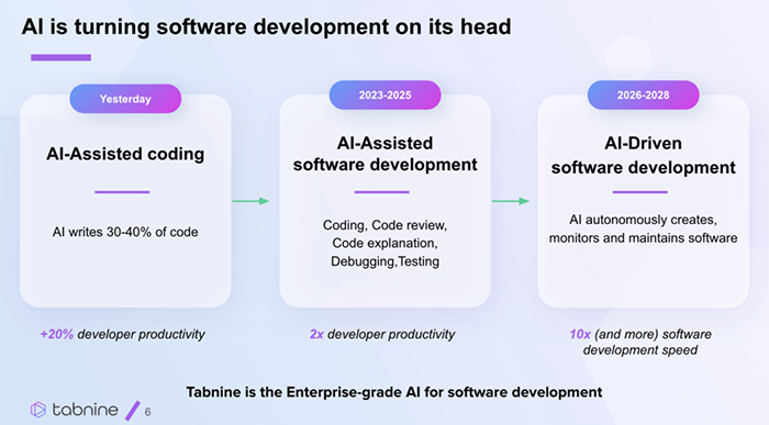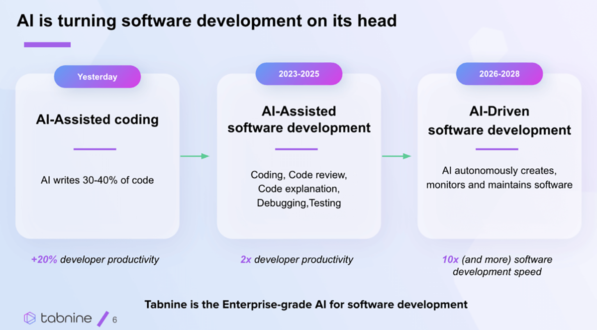 Pentru a specula asupra viitorului dezvoltării software-ului, putem învăța din istoria sa. Inițial, dezvoltarea software-ului se făcea cu instrucțiuni scrise aproape de codul mașină. Introducerea compilatoarelor și a interpretoarelor a permis dezvoltatorilor să scrie cod la un nivel mai înalt, realizând mai mult cu mai puțin efort. Instrumentele de asistență pentru cod creează o schimbare similară; dezvoltatorii vor contura ce ar trebui să facă software-ul dezvoltat, iar AI-ul va genera codul propriu-zis.
