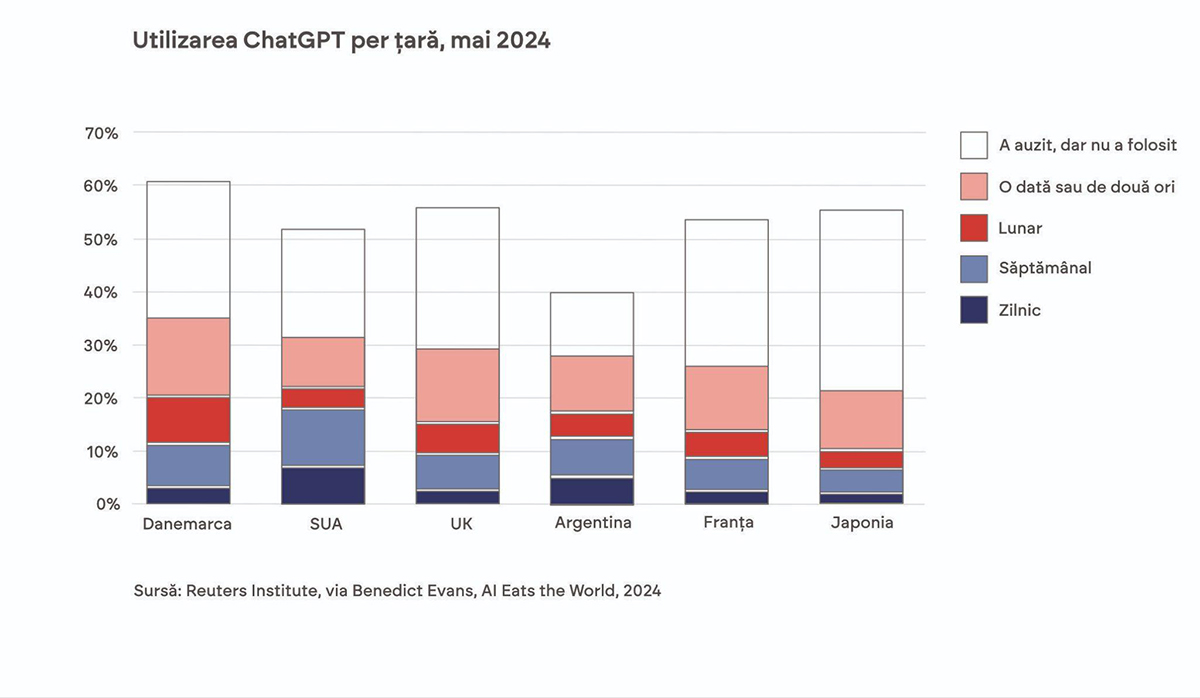Important de știut este că Generative AI (GenAI) este mai puțin adoptat decât știrile și social media ne-ar face să credem. În jur de 10% din oamenii din majoritatea țărilor folosesc ChatGPT cel puțin săptămânal.