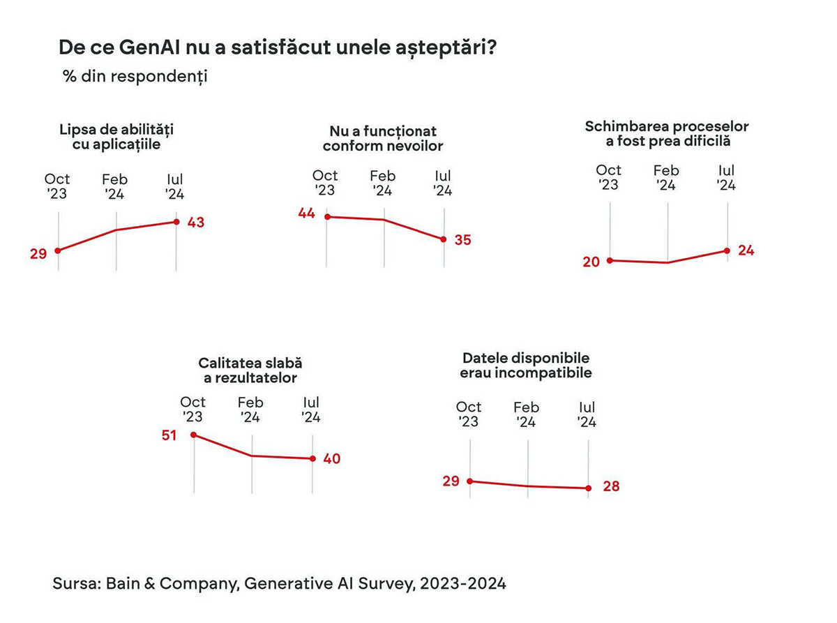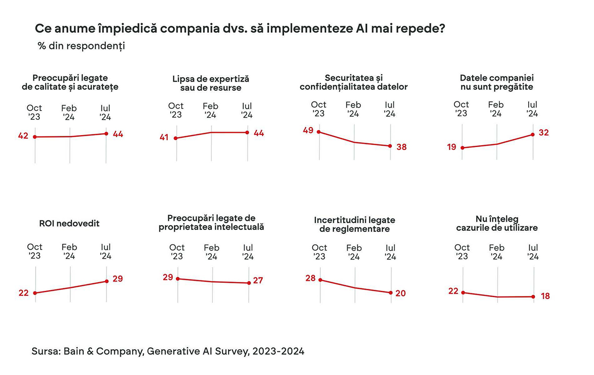 Un studiu al companiei de consultanță Bain arată că organizațiile încă încearcă să caute cele mai bune metode să aplice AI-ul în contextul lor: să își pregătească infrastructura de date, echipele și multe altele.