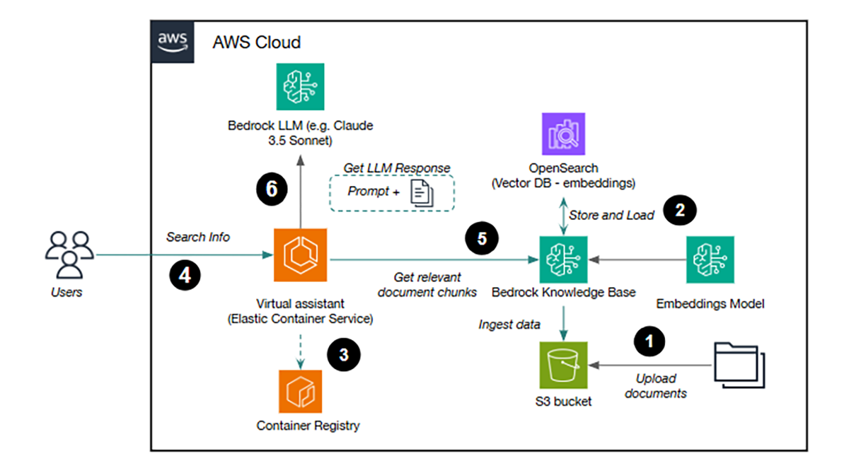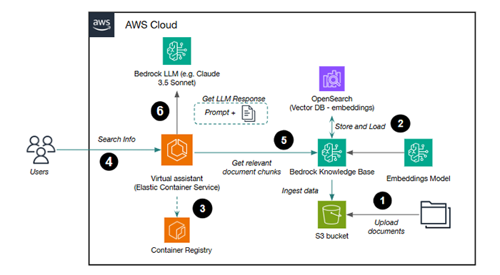 Modelele de inteligență artificială nu pot interpreta în mod direct documentele noastre, fie că vorbim de conținut text sau imagini. Aceste surse de date nestructurate trec printr-un proces de vectorizare prin care, în funcție de dimensiunea fiecărui fișier, sunt împărțite în secțiuni mai mici (chunking) și transformate în tokeni, care ulterior sunt reprezentați sub formă numerică în vectori multidimensionali sau embeddings. Aceste structuri de date sunt la rândul lor stocate într-o bază de date pentru vectori, printre cele mai populare fiind OpenSearch, Chroma, Pinecone sau PostgreSQL (pgvector). Operațiunea de vectorizare este realizată de un model separat numit embeddings model. Când un sistem RAG primește o solicitare, aceasta este vectorizată și utilizată pentru a căuta secțiuni relevante din documentele noastre în baza de date. Pentru a simplifica tot acest proces și a implementa rapid un sistem RAG, putem crea un Bedrock Knowledge Base. Prin această capabilitate, ne putem conecta cu ușurință la diferite surse de date pentru a procesa documente în mai multe formate și pentru a crea în mod automat o bază de date pentru vectori.