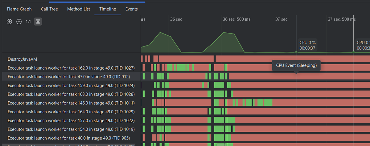 Haide să ne uităm și la tabul de Timeline. Aici observăm threadurile de execuție și două culori magice: verde (timp de execuție pe CPU) și roșu (așteptare: IO, rețea, lockuri etc.). Și, te întrebi, de ce e aproape totul roșu? Exact, ai pus punctul pe "i". Există foarte multe situații - cum este și cea ilustrată în imagine - în care timpul petrecut efectiv în codul tău este doar o mică parte din timpul total de execuție. Restul este pur și simplu așteptare. Asta înseamnă că nu întotdeauna o problemă de performanță înseamnă "cod lent" - poate fi upstream lent, un serviciu extern care răspunde greu sau blocaje în rețea. Apropo, toate exemplele de până acum sunt cazuri reale, din producție, bazate pe probleme recente unde a trebuit să rulez sesiuni de profiling ca să înțeleg exact unde se pierdea timpul.