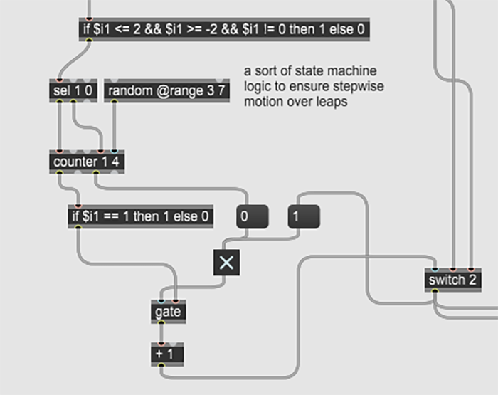 Revenind la programarea în Max/MSP, dacă intervalele sunt reprezentate prin numere de la 0 la 11 și lucrăm cu o secvență numerică, putem crea o logică de tip "gate" care forțează un anumit număr de pași treptați înainte de a permite apariția unui salt.