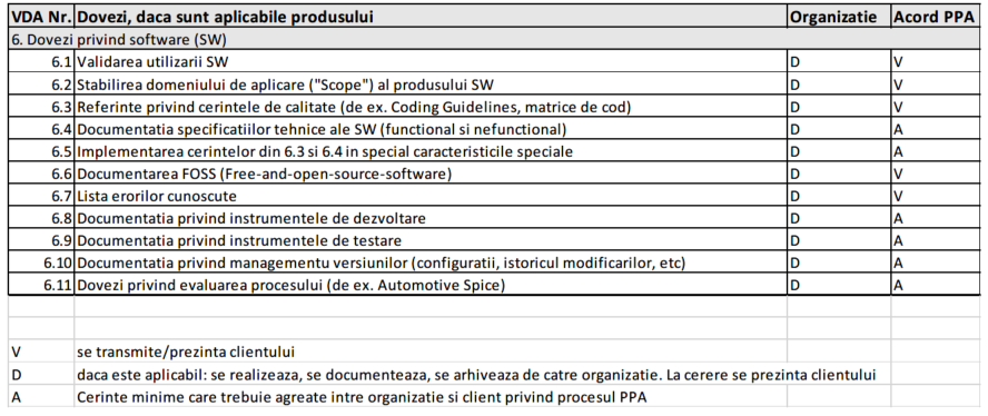 Concret, în acest volum VDA găsim șase categorii de cerințe pe care furnizorul trebuie să le pună la dispoziție producătorului. Primele cinci categorii se referă în mare parte la teme de producție și de HW: desenul tehnic, D/PFMEA, materialele conform IMDS, planul de control, caracteristicile produsului, dovezi de validare a procesului de producție etc.