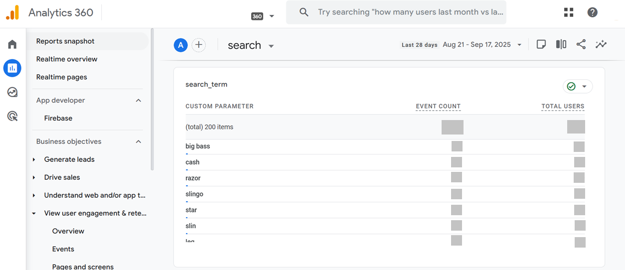 Folosind datele legate de user engagement din Google Analytics (GA4), în secțiunea Events, putem găsi o listă a termenilor care au fost căutați de utilizatori folosind search barul de pe site-ul nostru. Pentru ca acest raport să fie disponibil în GA4, este nevoie să ne asigurăm că în GA4 opțiunea de Site search tracking este activă.