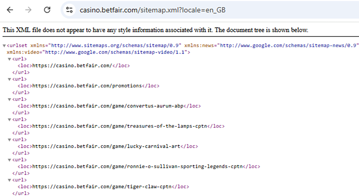 Extras din XML Sitemap al site-ului casino.betfair.com, versiunea engleză pentru Marea Britanie