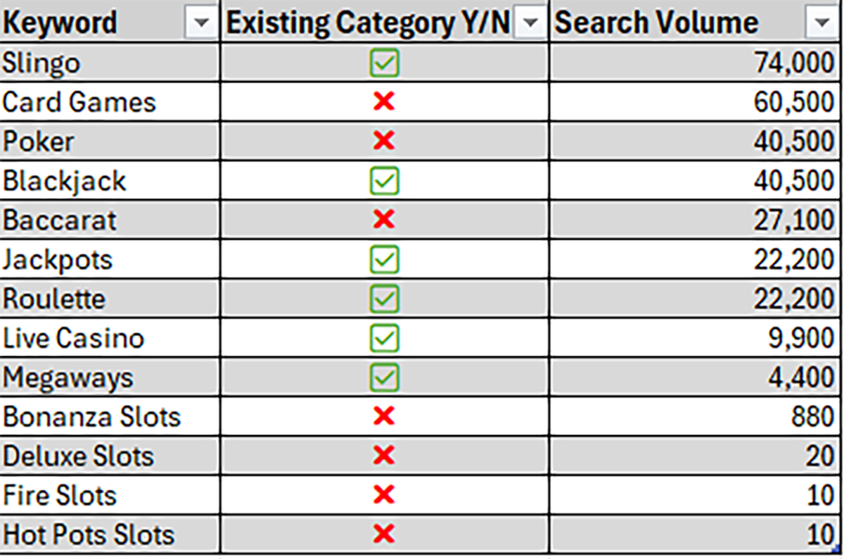 Pentru că site-ul Betfair Casino avea deja o serie de categorii existente, a fost necesar un pas intermediar de identificare a acestora, pentru a exclude o posibilă canibalizare.