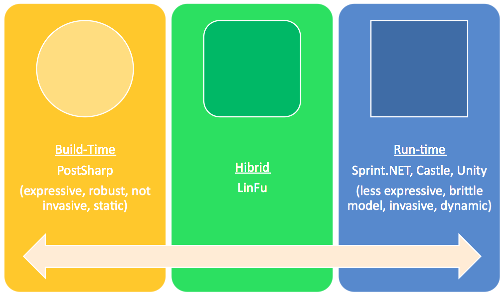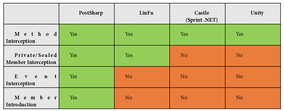 După cum putem observa în diagrama de mai sus, cel mai robust framework și flexibil este PostSharp. Acesta injectează în momentul compilării tot ce este nevoie în cod pentru a putea adăuga funcționalitatea de care avem nevoie. Pe când un framework ca Unity nu va modifica codul generat de compilator, iar la runtime va injecta prin reflection și alte mecanisme cu această funcționalitate. Din punct de vedere a performanței, injectarea la runtime a funcționalități are un preț – performanța.