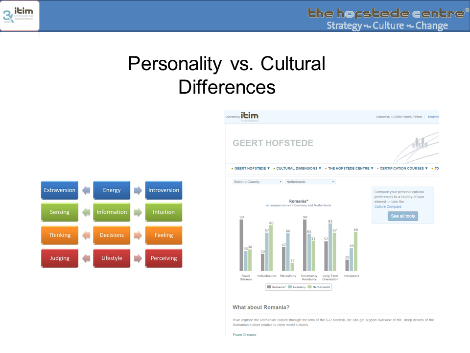 Am avut recent plăcerea de a avea între participanții la unul dintre Workshop-urile mele pe Diferenţe Culturale (Cultural Differences) un General Manager, extrem de inteligent, care susținea că nu este corect să afirmăm că oamenii aparținând aceluiași culturi au tendința de a se comporta similar între ei, și diferit față de oamenii dintr-o altă cultură. Din punctul lui de vedere, totul se reduce la personalitatea fiecăruia (Individual Personality).