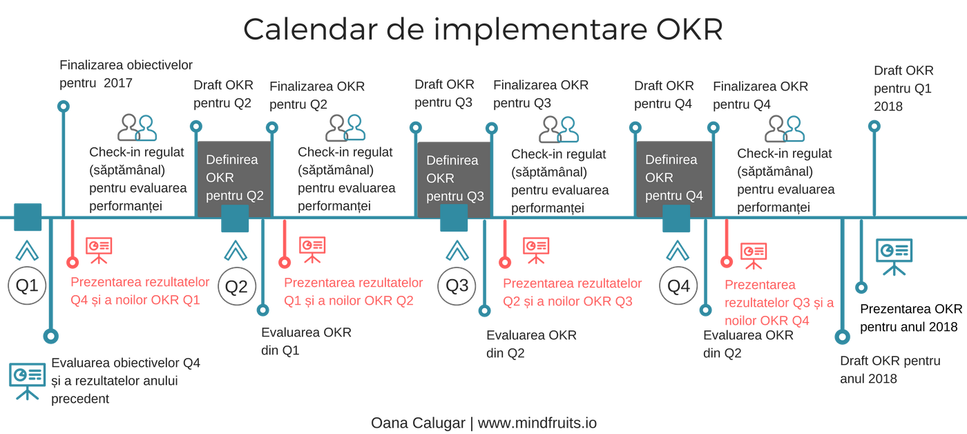 OKR este un set obiective şi rezultate cheie măsurabile pe care ni le stabilim trimestrial. Fiecare obiectiv are un responsabil, iar la sfârşitul fiecărui trimestru tragem linie şi facem bilanţul: câte dintre obiectivele propuse am reuşit să le îndeplinim? În continuare, vom analiza un calendar de implementare al OKR într-o companie, cu o imagine anuală și lunară a activităților