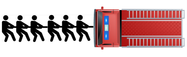 Acum câțiva ani, am participat la un team building în care a trebuit să tragem un camion de pompieri cu ajutorul unor frânghii. Aveam mai multe frânghii la dispoziție, așa că, împreună cu echipa mea, am hotărât să folosim două frânghii și să le legăm de partea din față a camionului, sub semnalizatoare, în unghi de 45 de grade, astfel: